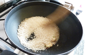 Poi mettete nel wok uno spicchio d'aglio con poco olio di oliva e aggiungeteci le alici sotto sale, pulite e lavate (guardate alla sezione Come si fa se volete istruzioni per pulirle). Man mano che l'olio si scalda, le alici si scioglieranno. Fate dorare l'aglio e poi unite il riso e fatelo tostare.